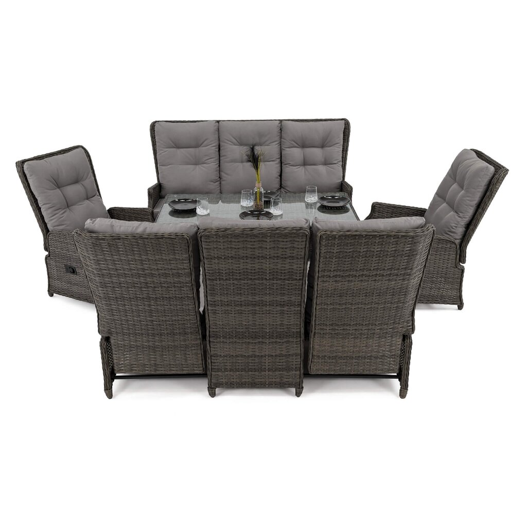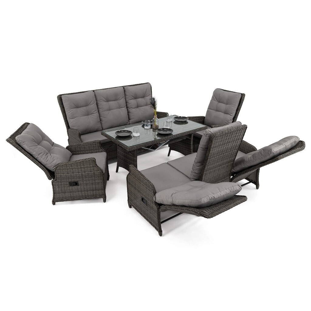 Komplektą sudaro: 1 reguliuojama trivietė sofa, 1 fiksuota trivietė sofa, 2 reguliuojami foteliai,1 stalas