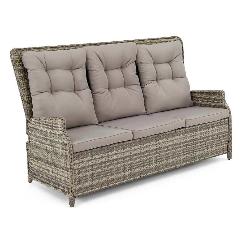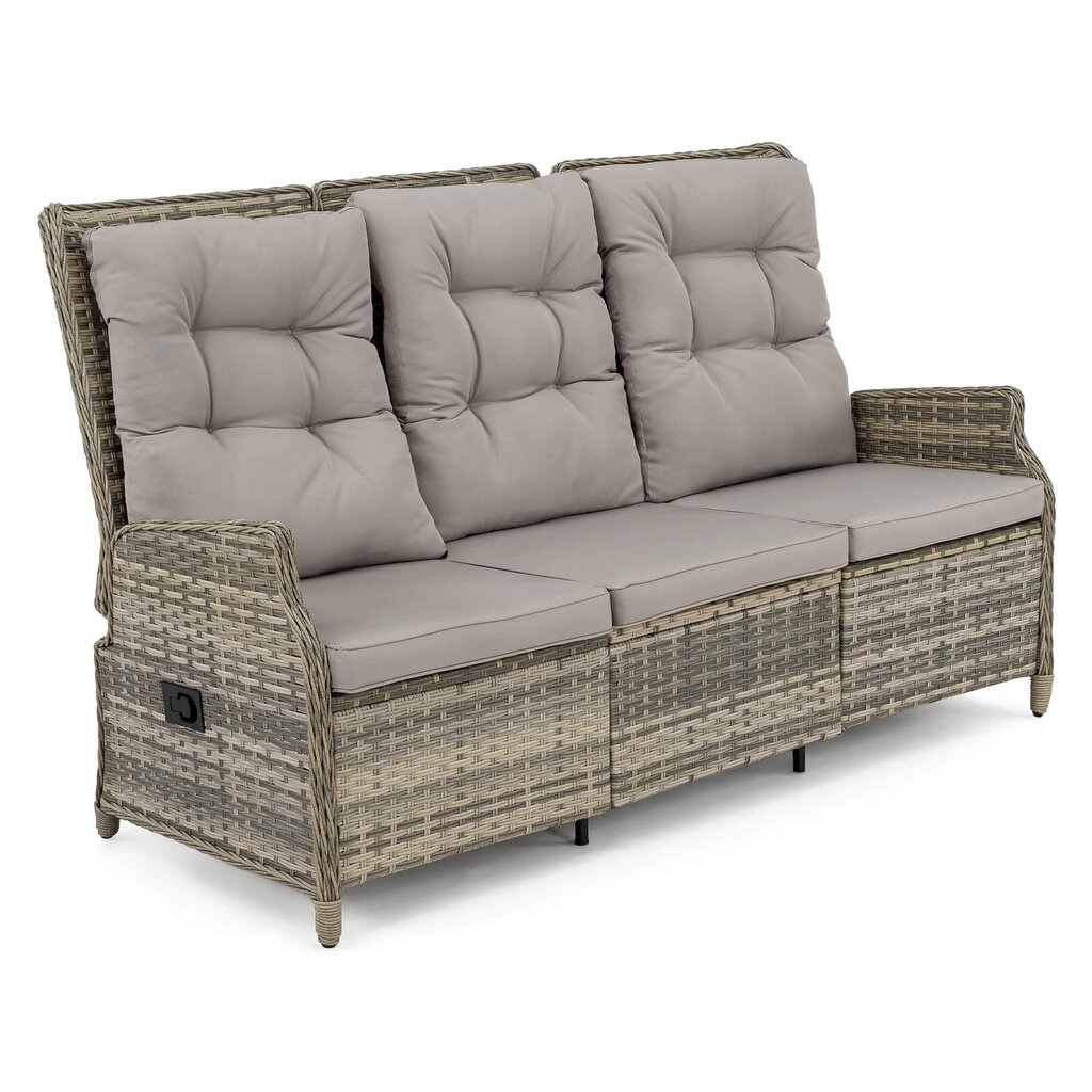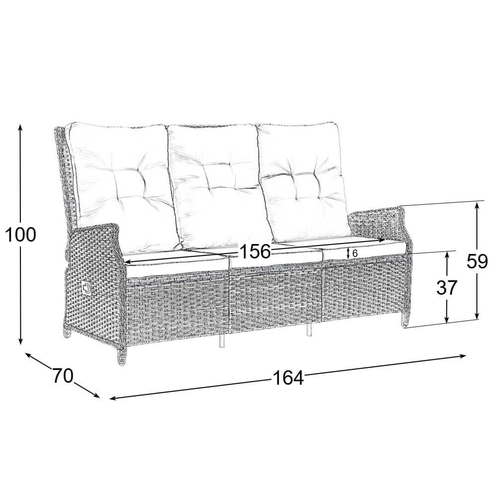 Komplektą sudaro: 1 reguliuojama trivietė sofa, 1 fiksuota trivietė sofa, 2 reguliuojami foteliai,1 stalas
