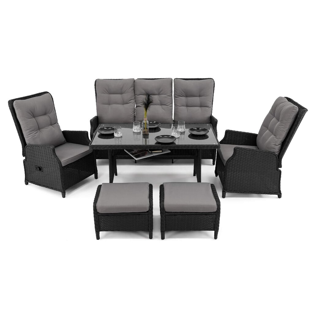 Komplektą sudaro: 1 reguliuojama trivietė sofa, 2 reguliuojami foteliai, 2 pufai ,1 stalas