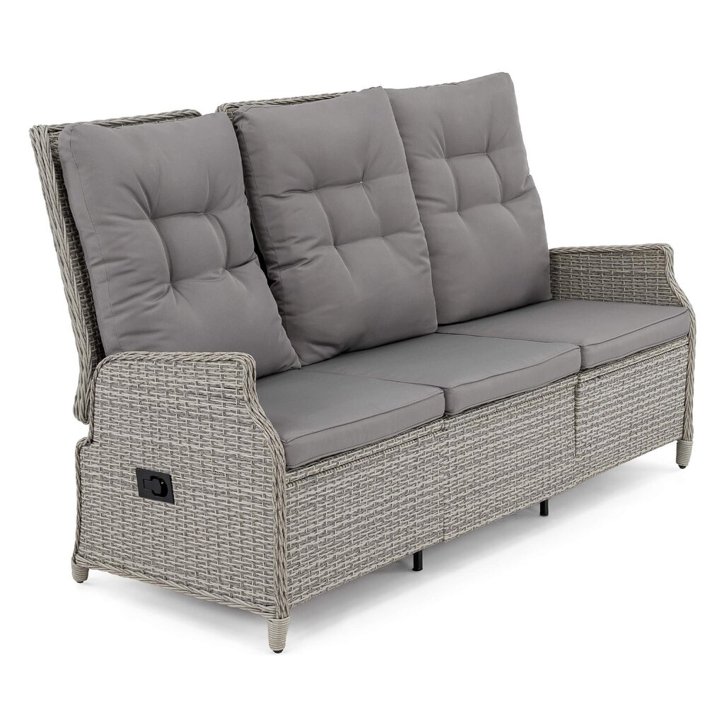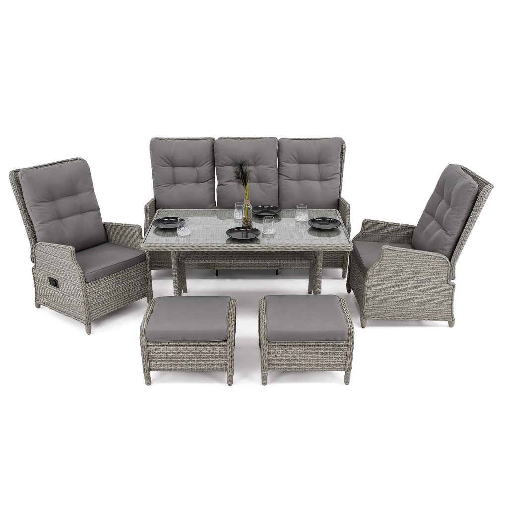 Komplektą sudaro: 1 reguliuojama trivietė sofa, 2 reguliuojami foteliai, 2 pufai ,1 stalas