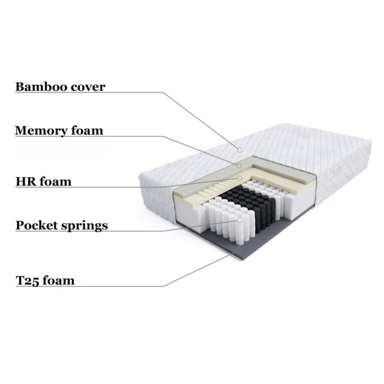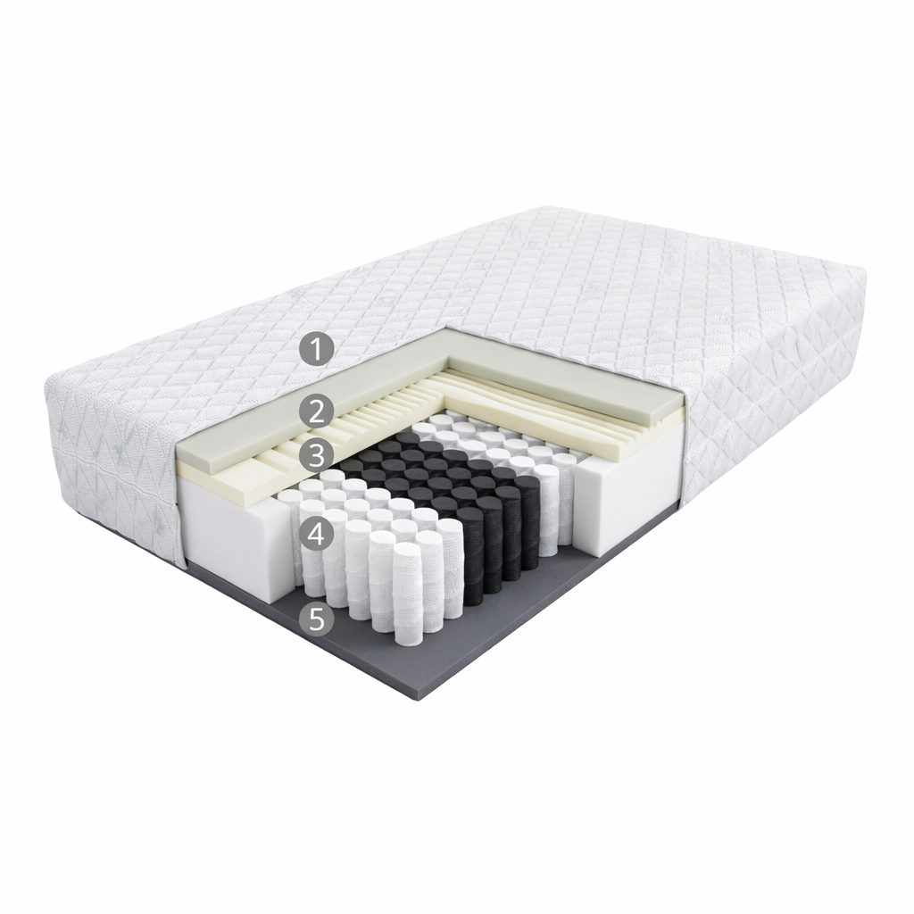 Kišeninės spyruoklės – puikiai prisitaiko prie kūno. Spyruoklės pagamintos iš aukštos kokybės 2,2 mm storio vielos ir yra atskirose medžiaginėse kišenėlėse, kurios pašalina nepageidaujamus garsus. Daugiasegmentė sistema užtikrina taškinį elastingumą – kiekviena spyruoklė reaguoja individualiai, prisitaikydama prie kūno spaudimo. Tai leidžia stuburui išlaikyti natūralią padėtį ir užtikrina aukštą miego komfortą.