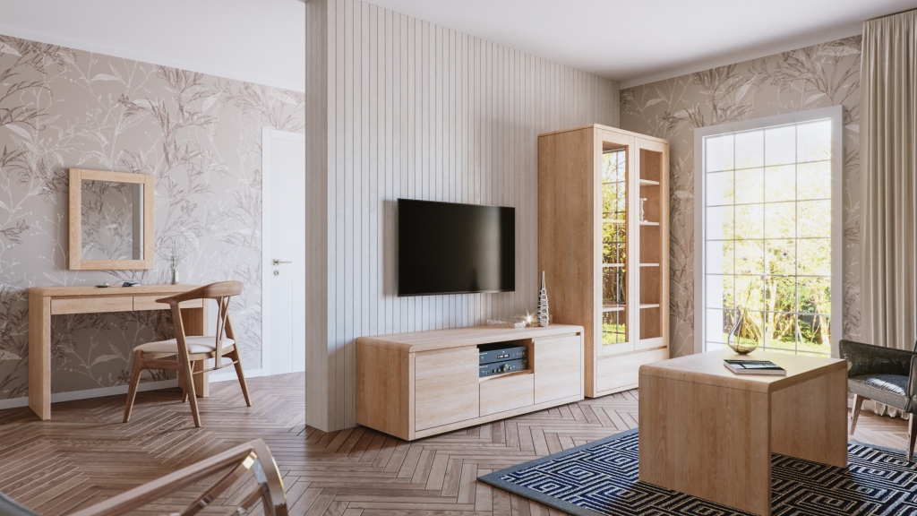 Baldų kolekcija „FUTURISTIKA” – šiuolaikiniams interjero sprendimams, nes suapvalinta baldų forma į bet kurią namų erdvę įneš savitą įspūdį, o natūralus medžio masyvas (bukas) neleidžia nutolti nuo gamtos.