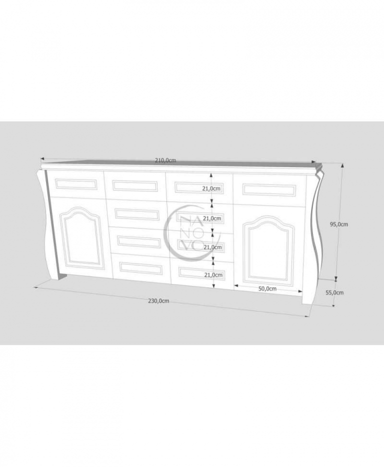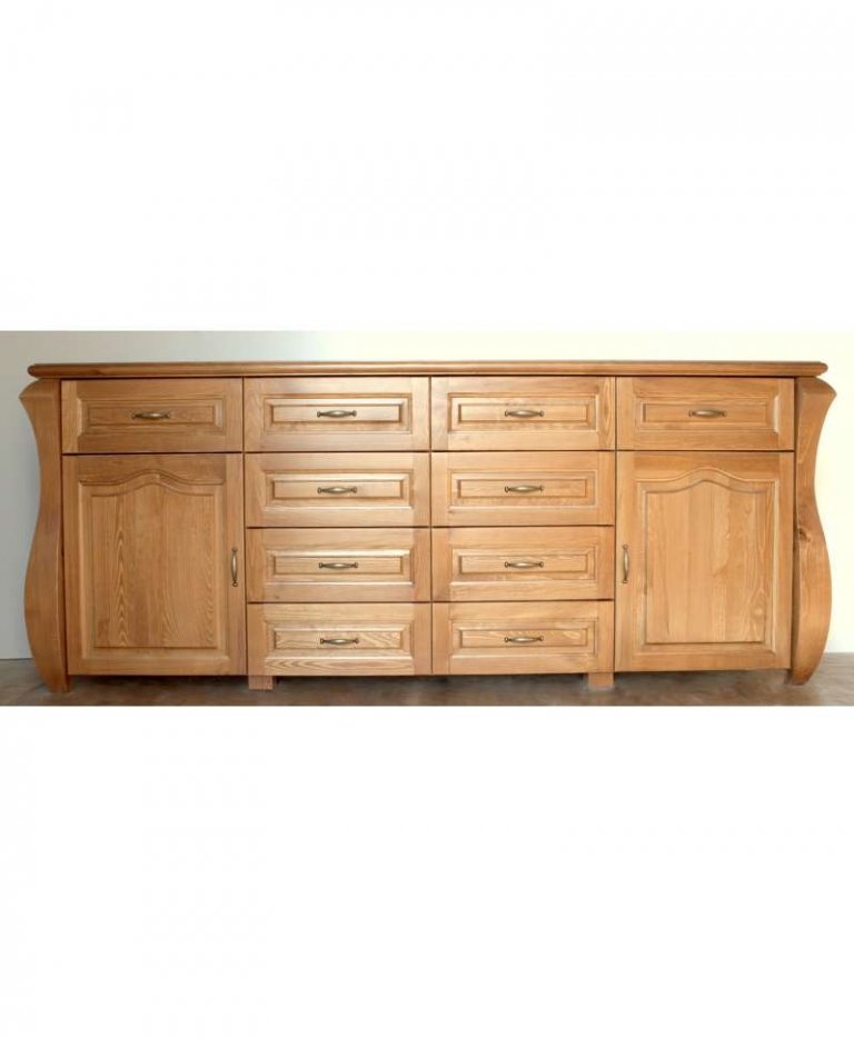 Ši natūralaus medžio masyvo (pušies) komoda yra romantinio stiliaus bei neįprastos formos. Masyvios kojos ir dekoratyviniai elementai, puošiantys komodos dureles ir stalčius, suteikia savitą charakterį visam interjerui ir įneša subtilios prabangos pojūtį. Tai didelis, masyvus, funkcionalus ir itin talpus baldas jūsų jaukiems namams.