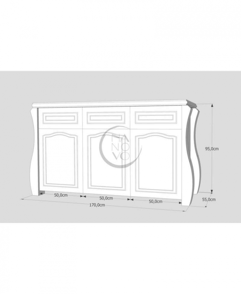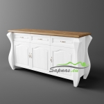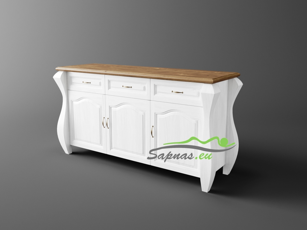 Ši natūralaus medžio masyvo (pušies) komoda yra romantinio stiliaus bei neįprastos formos. Masyvios kojos ir dekoratyviniai elementai, puošiantys komodos dureles, suteikia savitą charakterį visam interjerui ir įneša subtilios prabangos pojūtį. Komoda yra itin didelė, talpi ir patogios konstrukcijos.