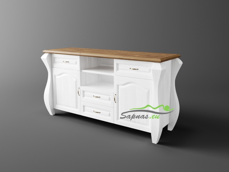 Ši natūralaus medžio masyvo (pušies) komoda yra romantinio stiliaus bei neįprastos formos. Masyvios kojos ir dekoratyviniai elementai, puošiantys komodos dureles, suteikia savitą charakterį visam interjerui ir įneša subtilios prabangos pojūtį. Dėl savo kruopščiai apgalvotos konstrukcijos, komoda yra ne tik stilinga, bet ir funkcionali bei itin talpi.