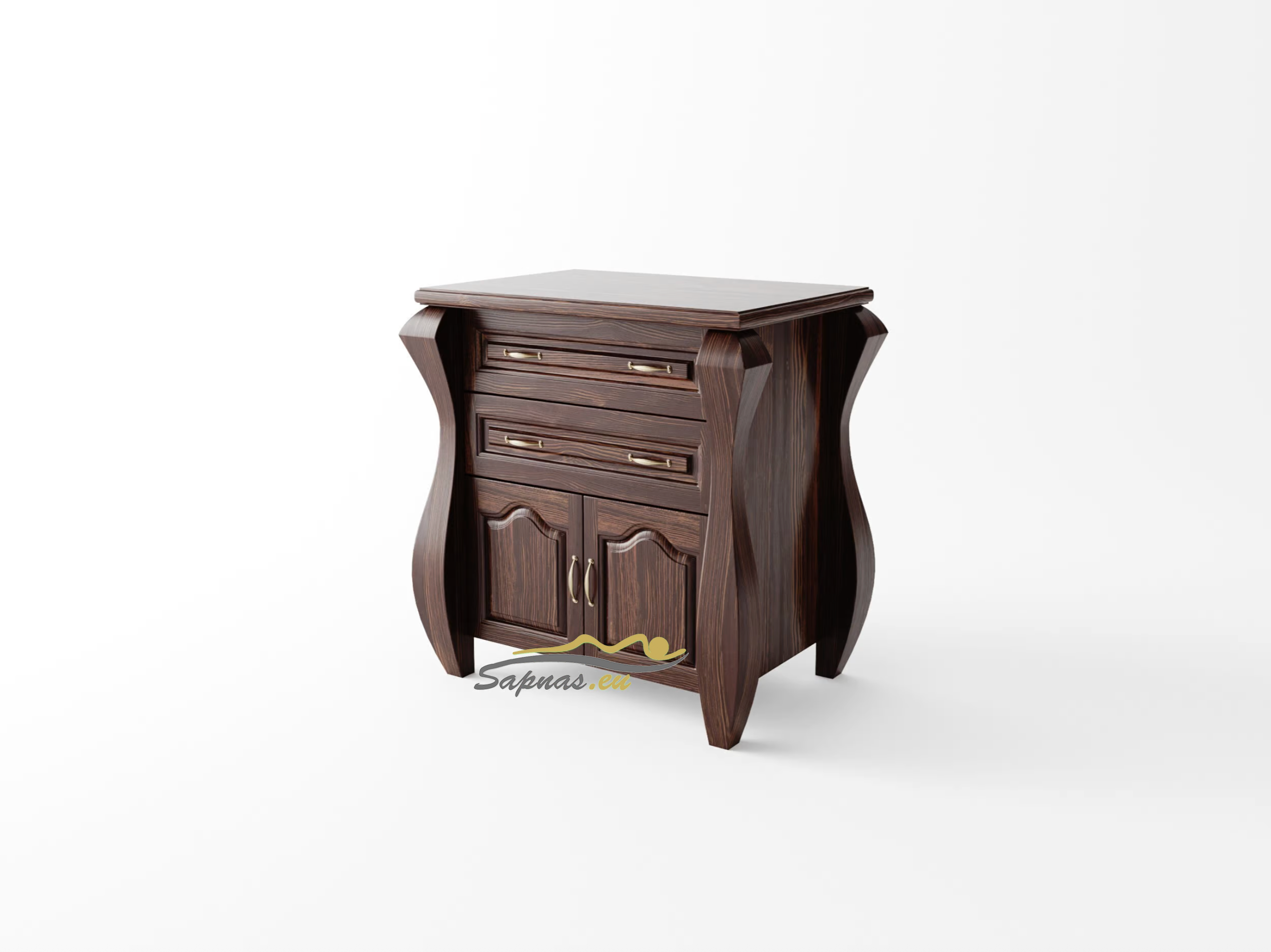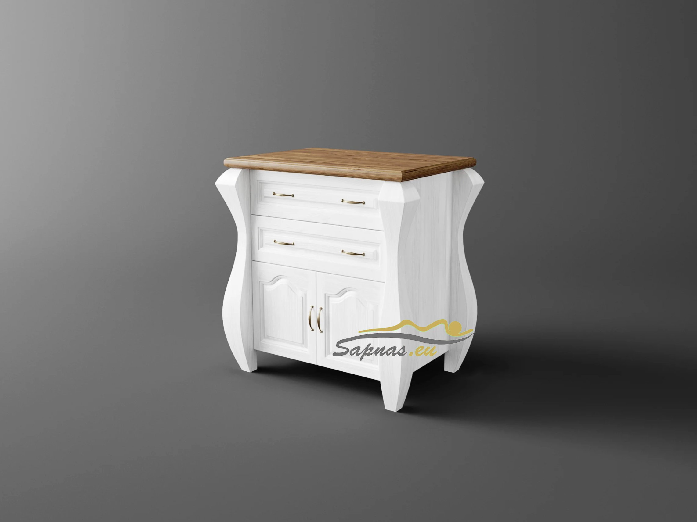 Ši natūralaus medžio masyvo (pušies) komoda yra romantinio stiliaus bei neįprastos formos. Masyvios kojos ir dekoratyviniai elementai, puošiantys komodos dureles, suteikia savitą charakterį visam interjerui ir įneša subtilios prabangos pojūtį. Nedidelė tačiau itin talpi komoda jaukiems jūsų namams.