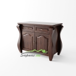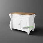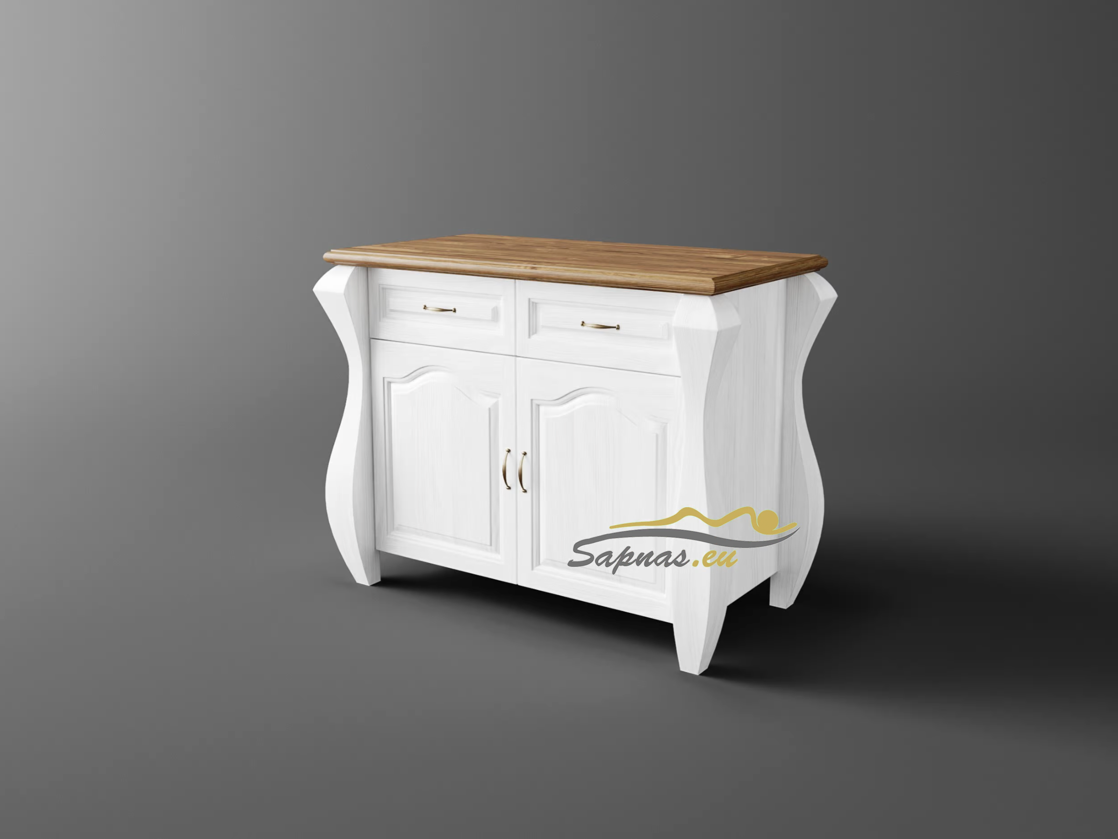 Ši natūralaus medžio masyvo (pušies) komoda yra romantinio stiliaus bei neįprastos formos. Masyvios kojos ir dekoratyviniai elementai, puošiantys komodos dureles, suteikia savitą charakterį visam interjerui ir įneša subtilios prabangos pojūtį. Komoda turi dvidurę spintelę ir su stalčius – tai patogus ir funkcionalus sprendimas jaukiems namams.