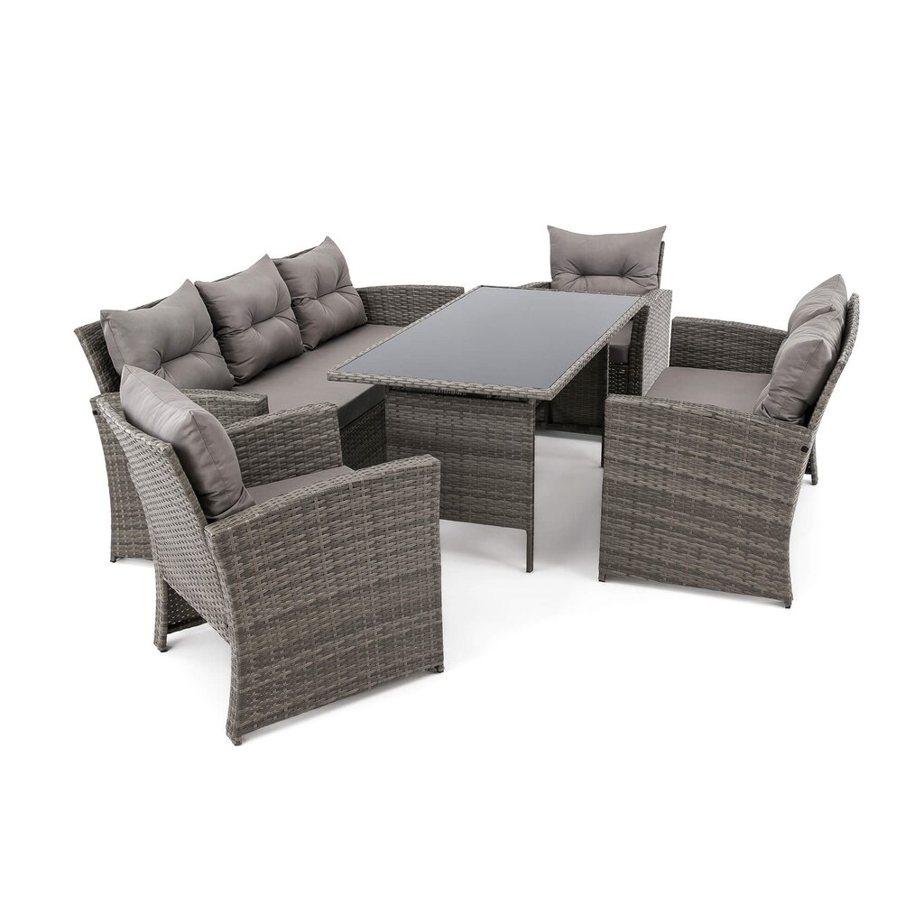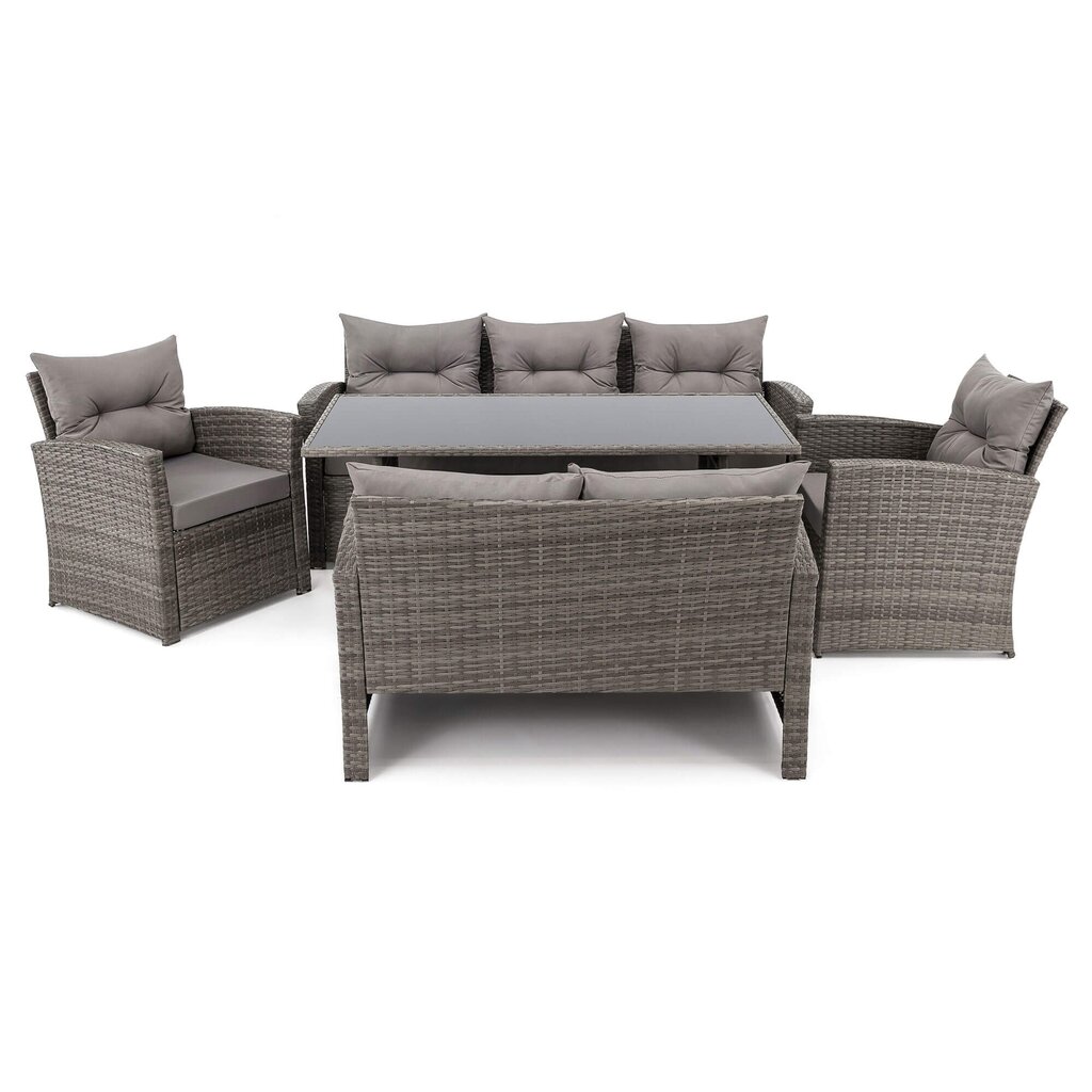 Komplektą sudaro: 1 trivietė sofa, 1 dvivietė sofa, 2 foteliai, 1 stalas