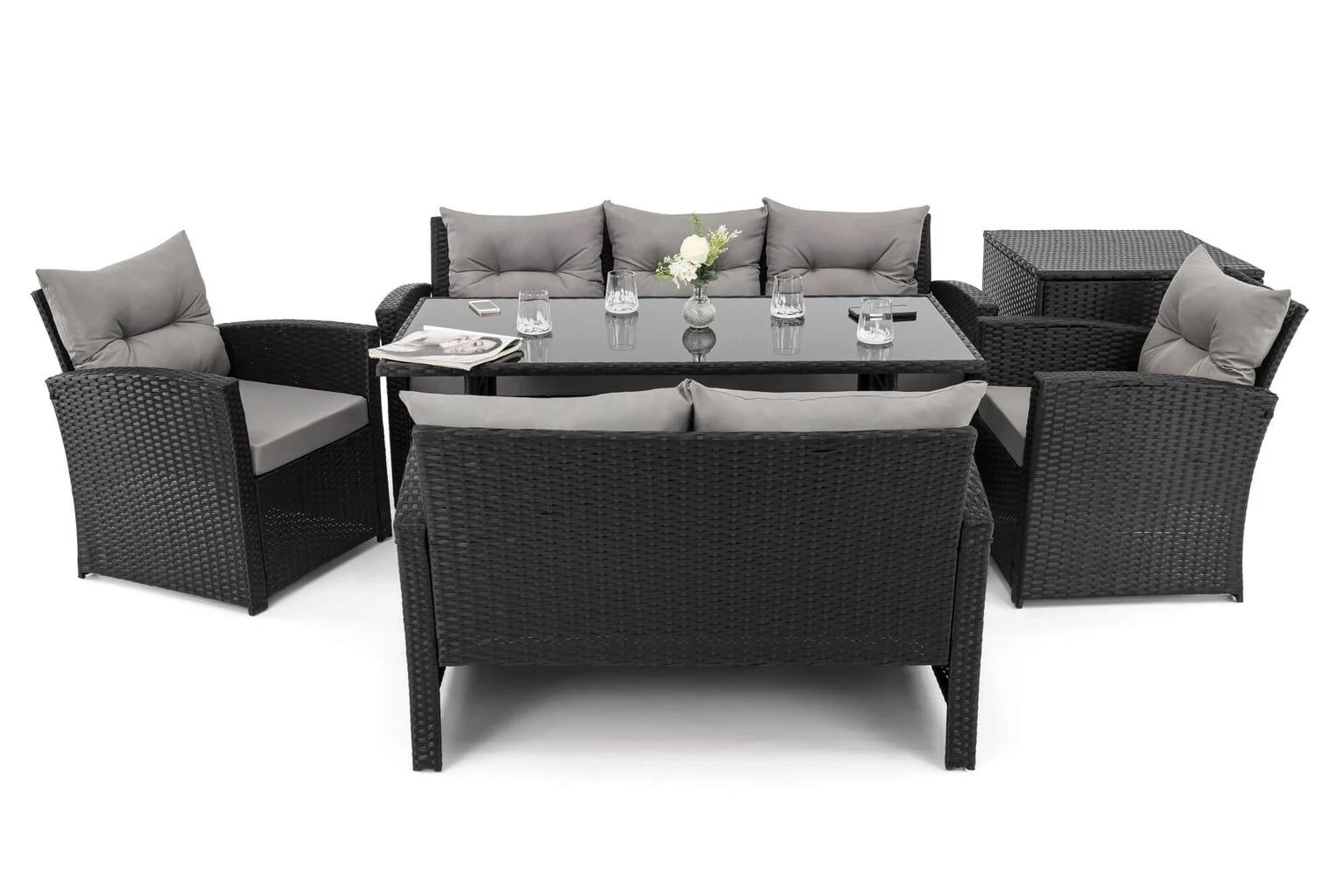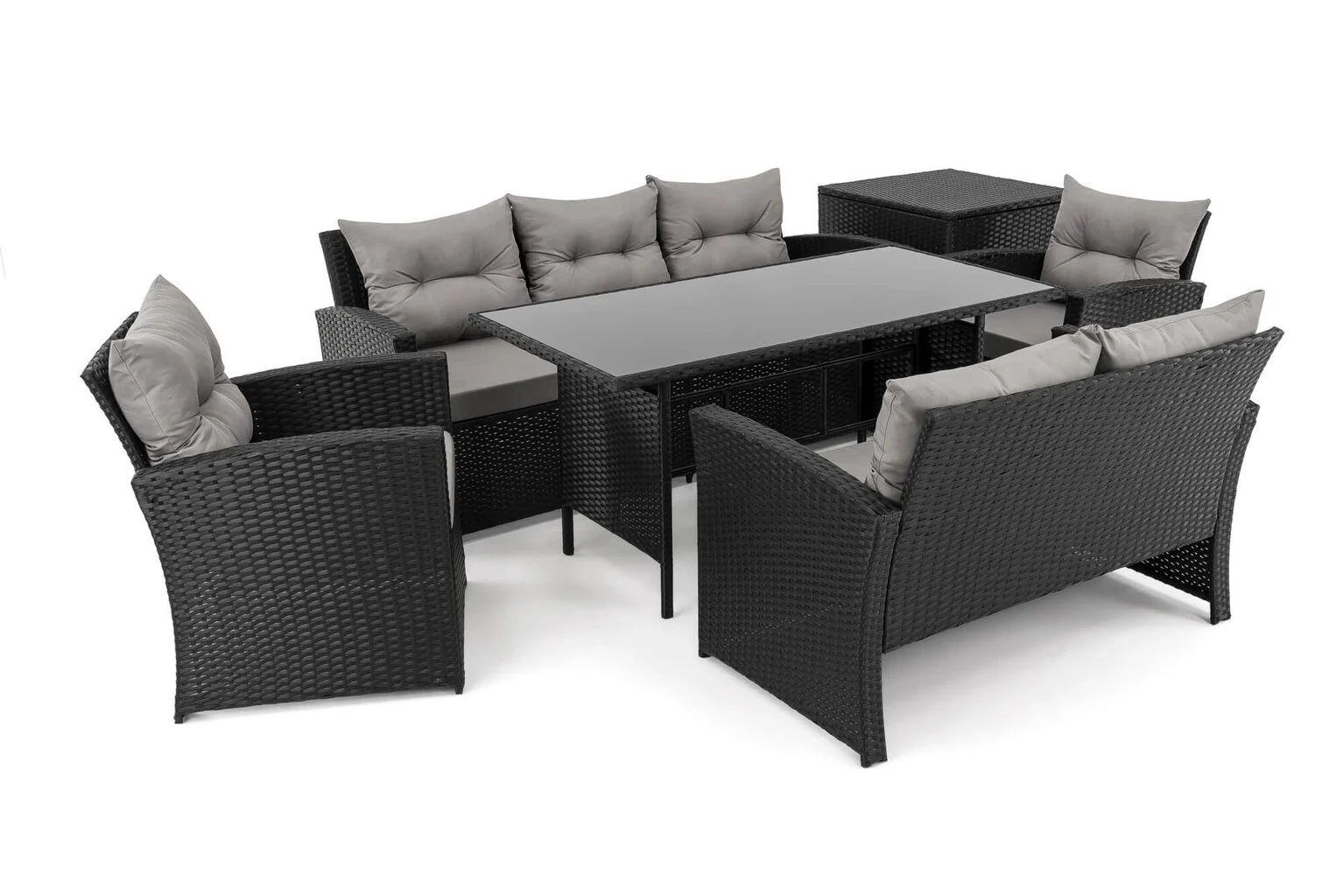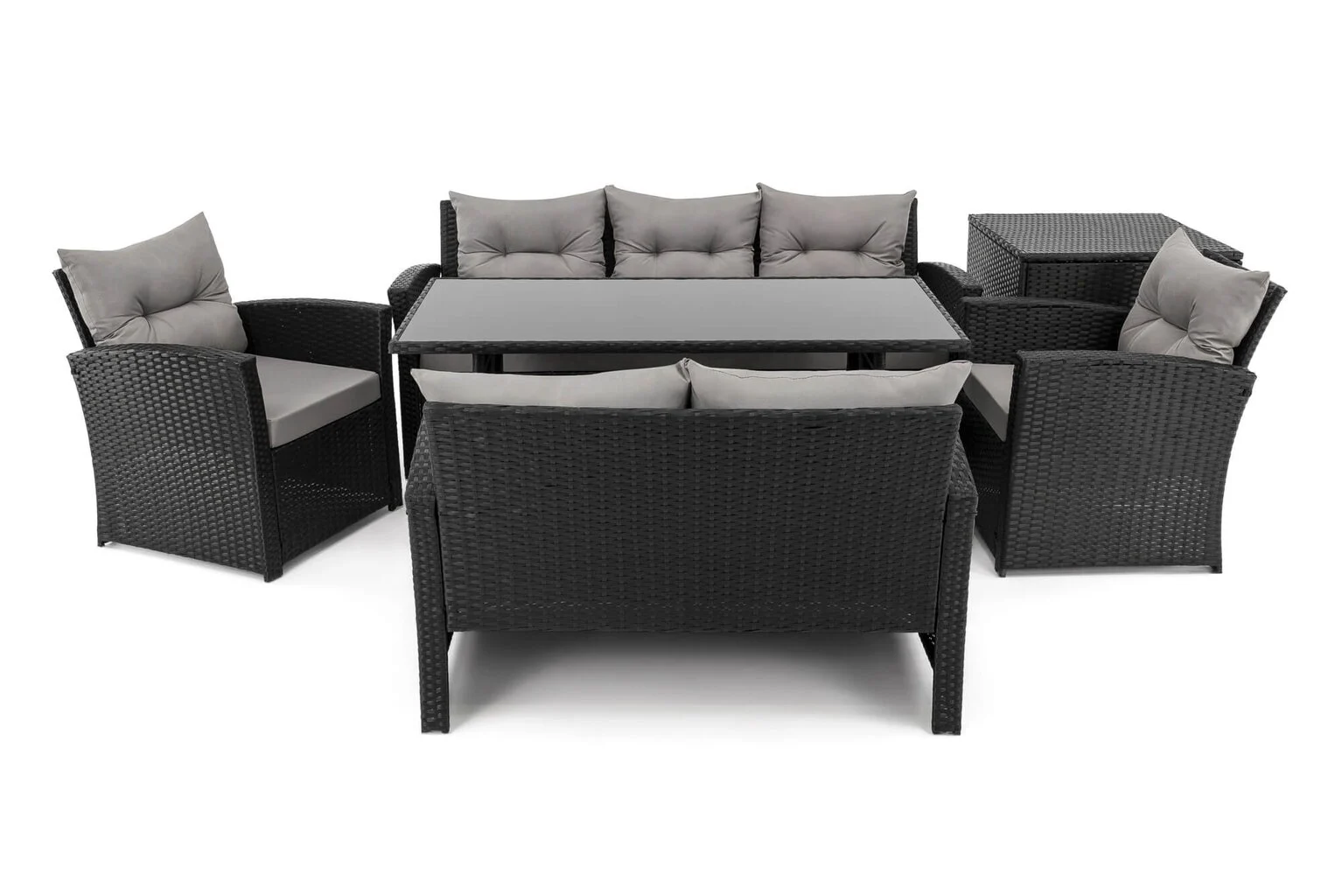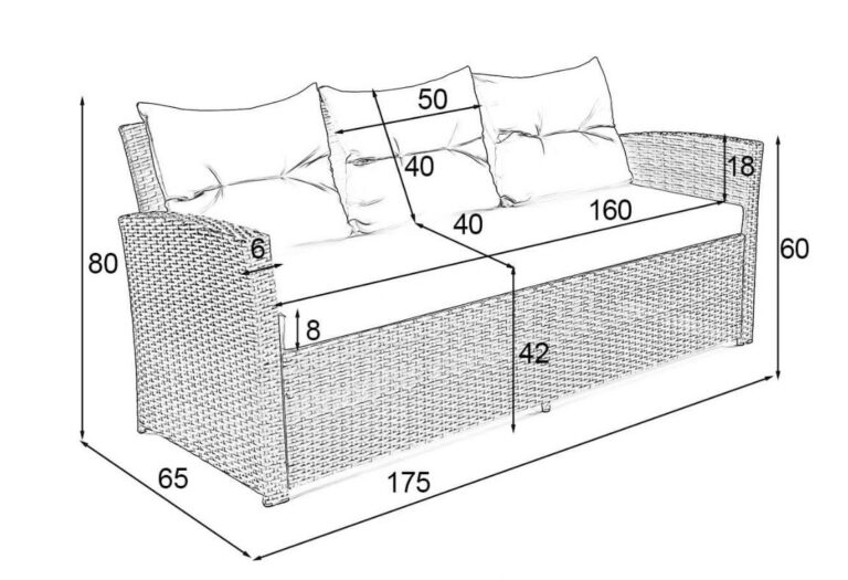 Komplektą sudaro: 1 trivietė sofa, 1 dvivietė sofa, 2 foteliai, 1 stalas, 1 dėžė pagalvėms