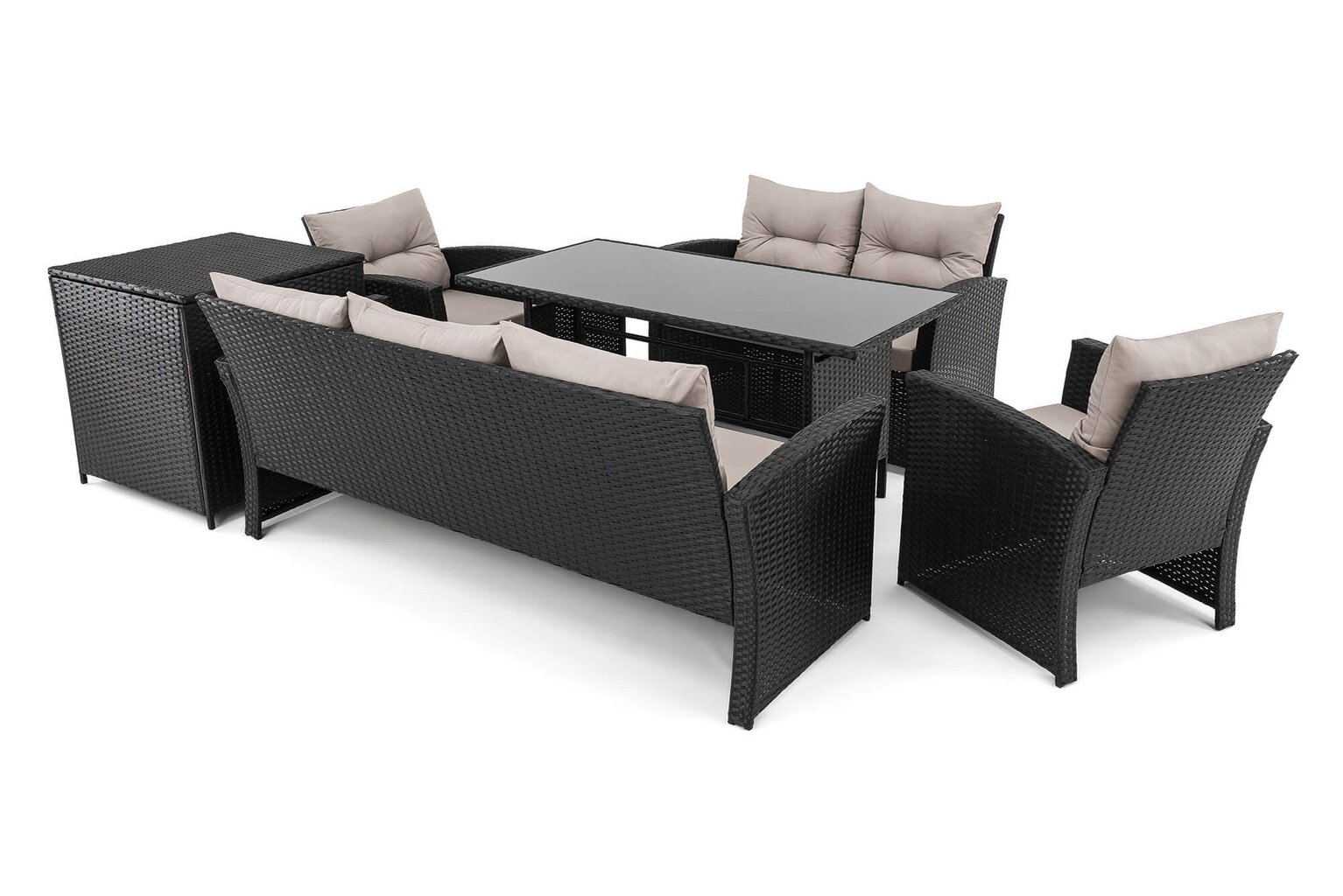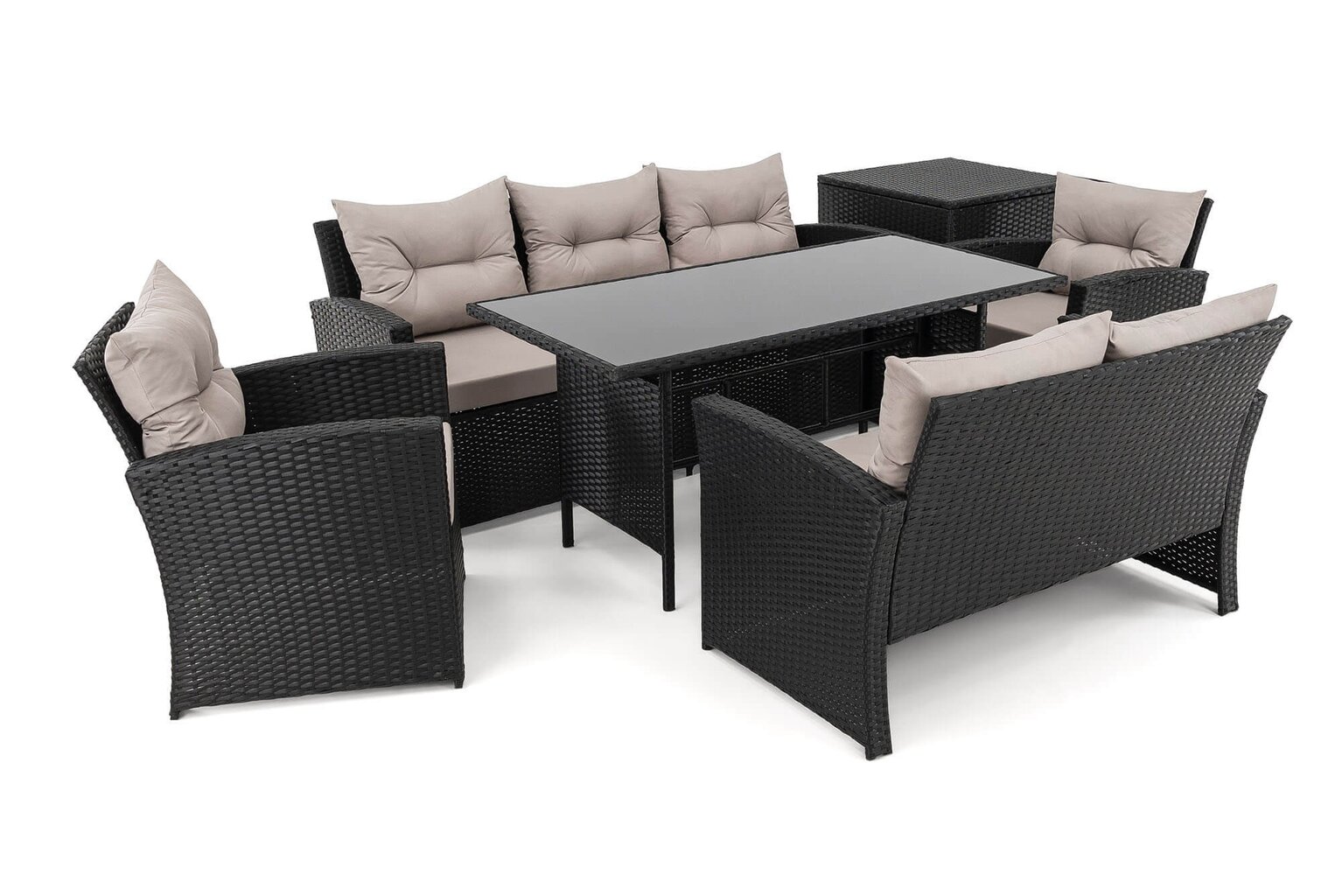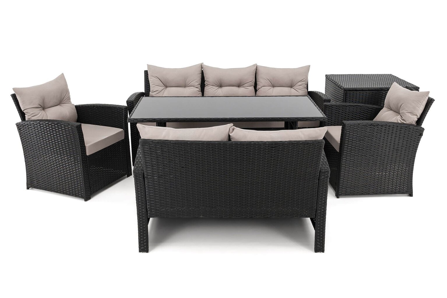Komplektą sudaro: 1 trivietė sofa, 1 dvivietė sofa, 2 foteliai, 1 stalas, 1 dėžė pagalvėms