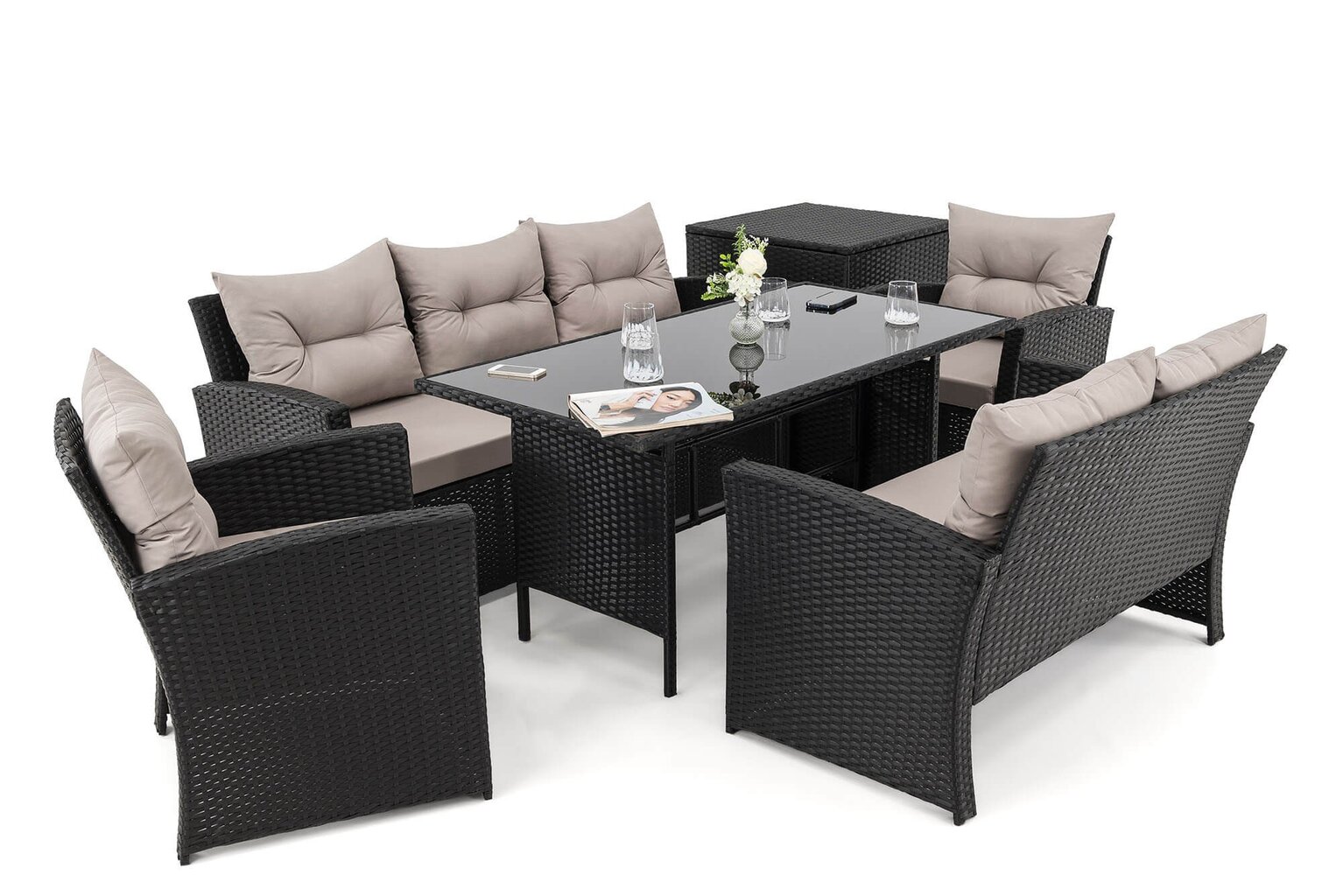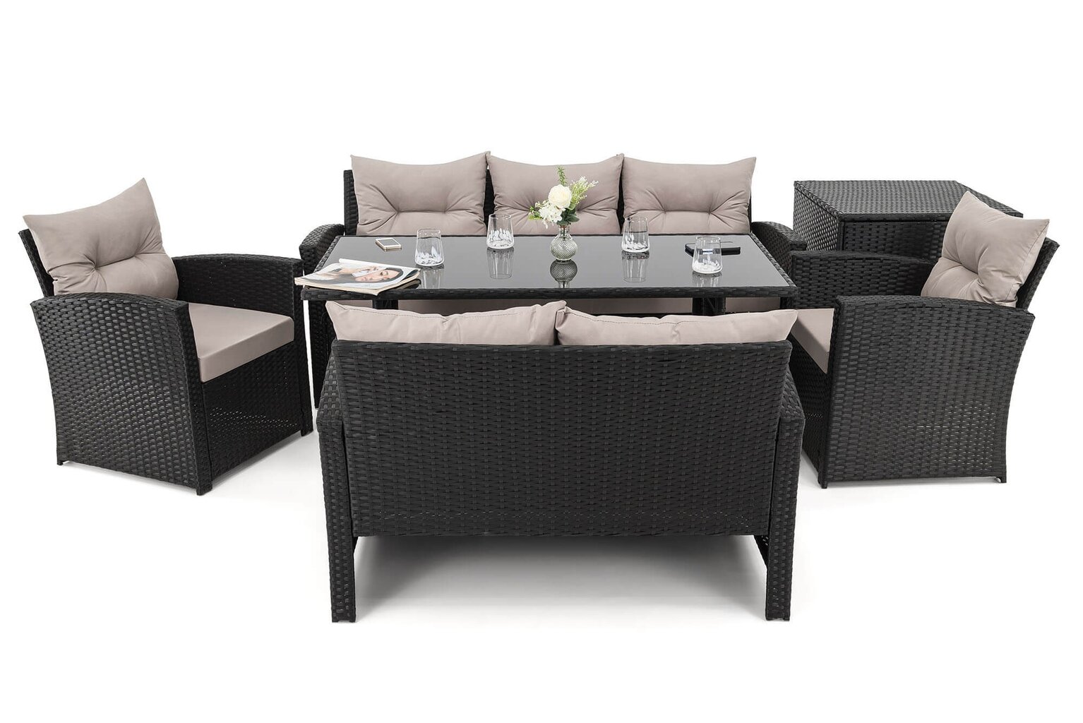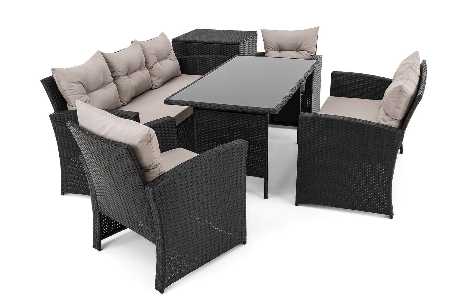 Komplektą sudaro: 1 trivietė sofa, 1 dvivietė sofa, 2 foteliai, 1 stalas, 1 dėžė pagalvėms