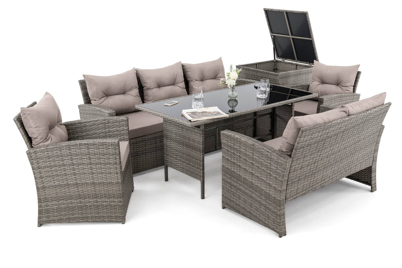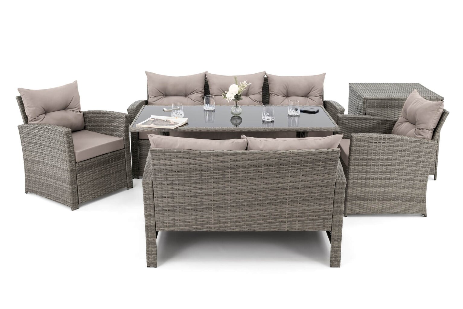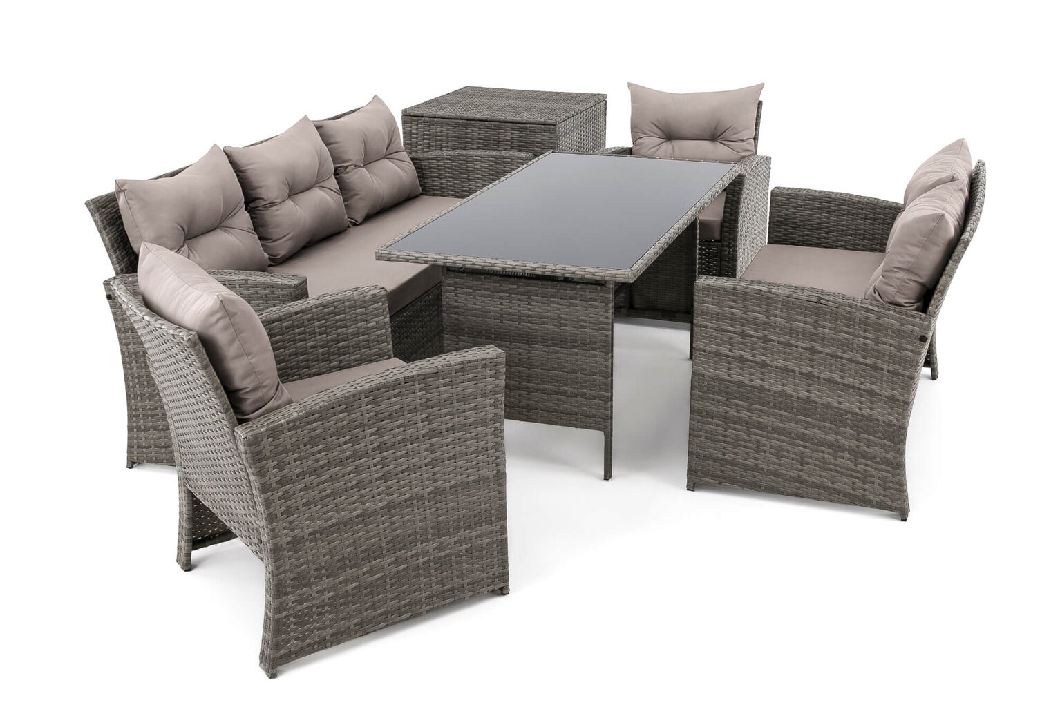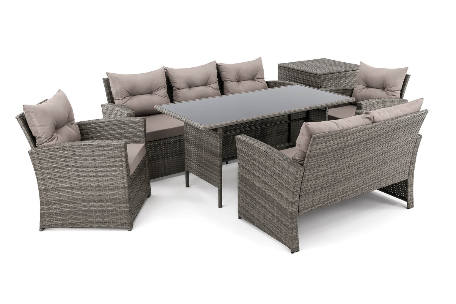 Komplektą sudaro: 1 trivietė sofa, 1 dvivietė sofa, 2 foteliai, 1 stalas, 1 dėžė pagalvėms