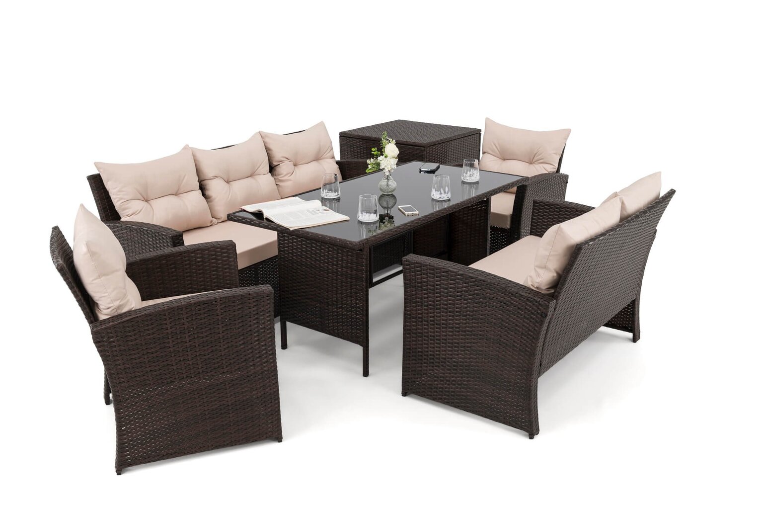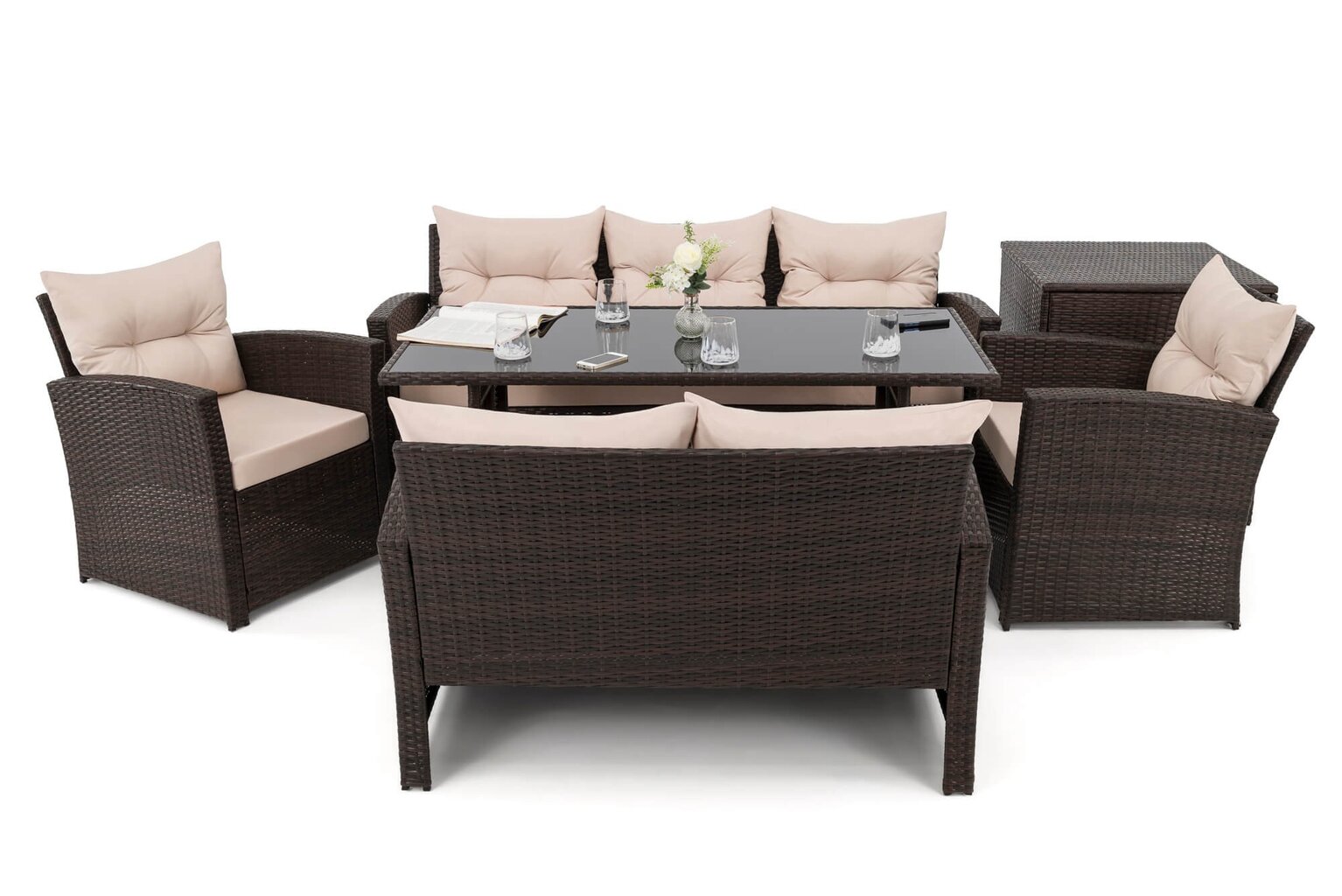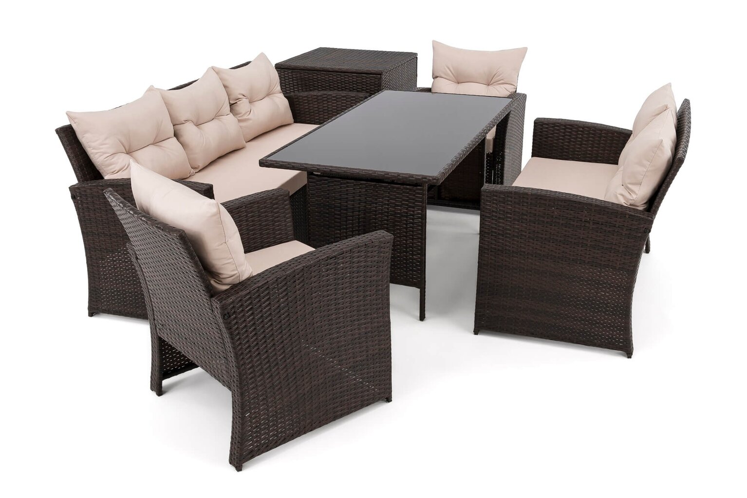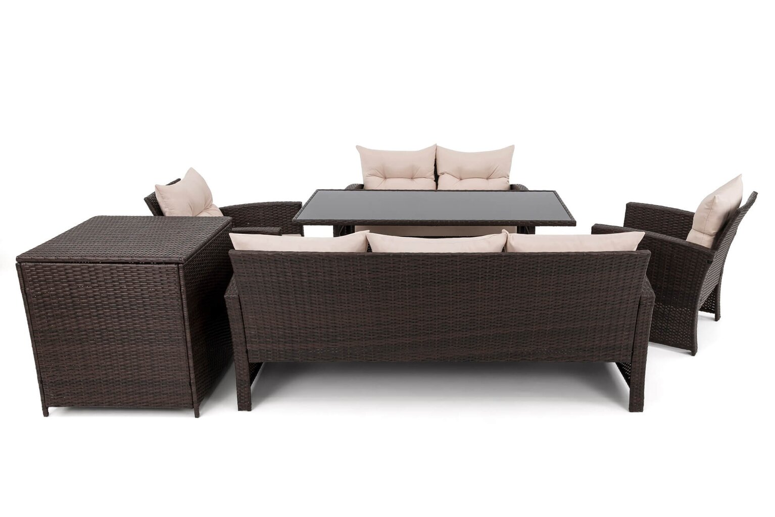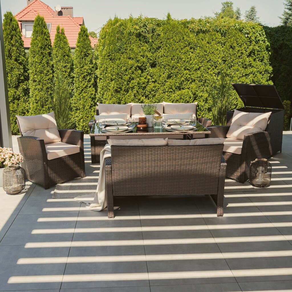 Komplektą sudaro: 1 trivietė sofa, 1 dvivietė sofa, 2 foteliai, 1 stalas, 1 dėžė pagalvėms
