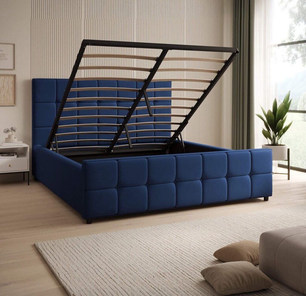 Lovoje EMPRESS yra įmontuotas pakeliamasis dujinis mechanizmas, kurio dėka yra labai patogu ir paprasta atverti dėžę, skirtą patalynės ir kitų daiktų laikymui.